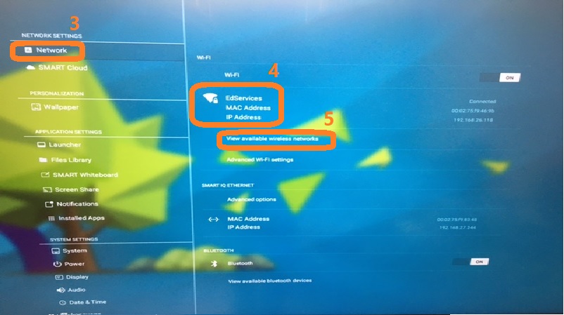 Wireless connectivity between a device and the SMART Board is achieved through the local Wi-Fi network. The Screen Sharing capability is only possible when both a device and the SMART Board are connected to the SAME Wi-Fi network. Follow the steps below to identify the Wi-Fi network the SMART Board is connected to.