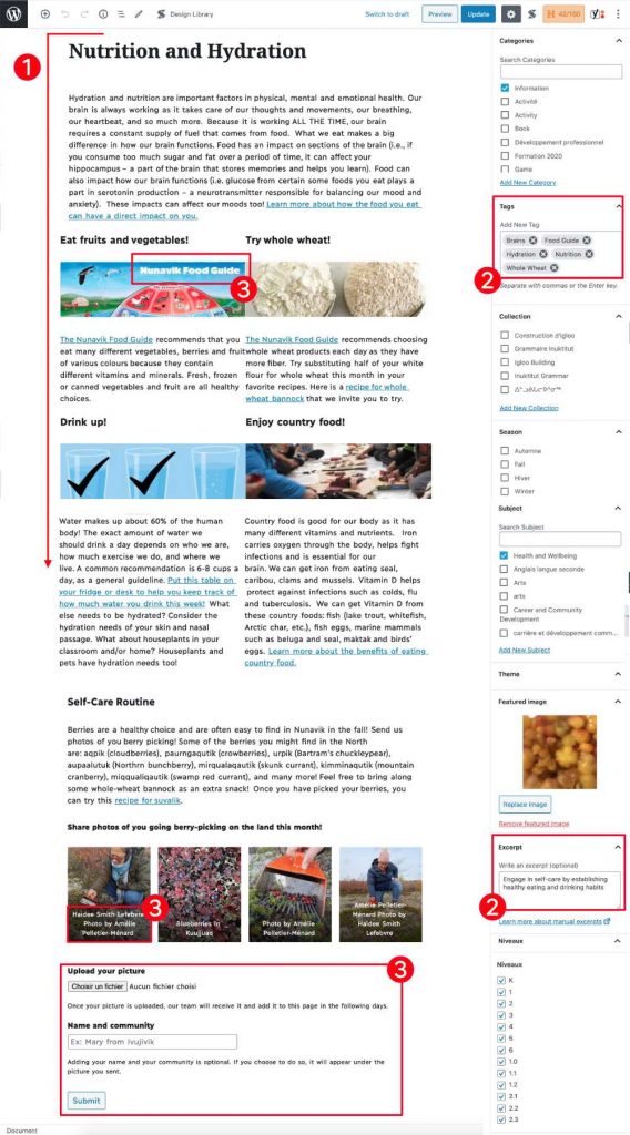 The process of creating posts to introduce resources on Nunavik-IcE is the core of this online training. Throughout modules 2a, b and c, you will create your first post in the backend of the site.
