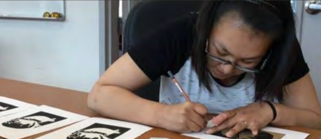 Au Nunavik, Lyne Bastien, en collaboration avec Kativik Ilisaniliriniq, donne trois ateliers de linogravure par année dans différentes communautés pour faire revivre l’art de la gravure. La linogravure est un procédé d’impression en relief qui est très similaire à l’impression en taille de pierre. Avec la linogravure, on fait un dessin puis on le transfère sur une plaque de caoutchouc souple qui est encrée avant d’être imprimée sur papier. Trois artistes d’Ivujivik, en collaboration avec Lyne Bastien, ont travaillé sur un projet collectif intitulé « Convergence/Nord Sud » qui a été exposé au Feheley Fine Art, à Toronto, en 2008 et à la Foire d’art de Papier Montréal, en 2019.
