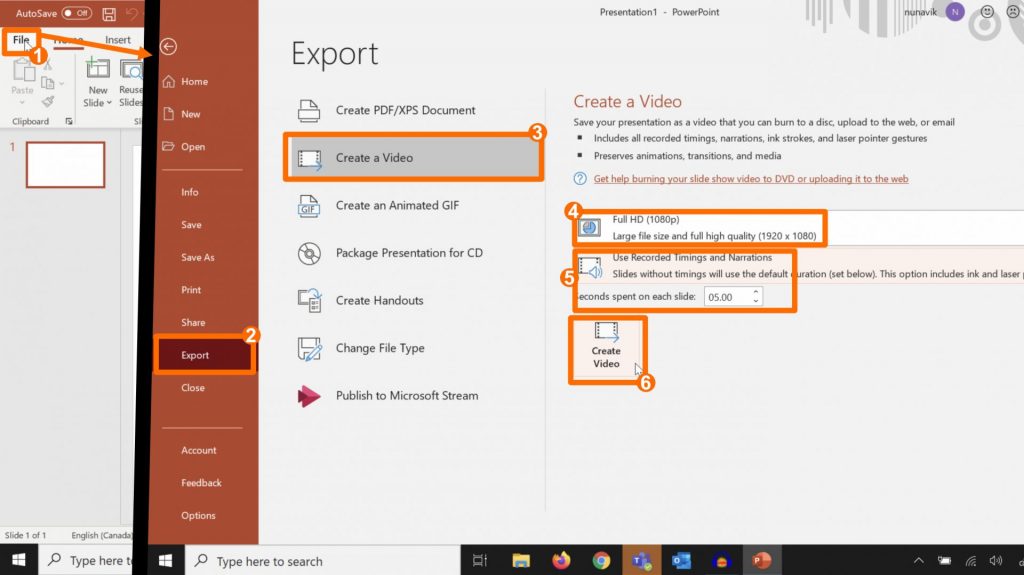 - Make sure to select Use Recorded Timings and Narrations. This way your video will spend the time you specified at step 28 on each page. Ignore the 5 seconds information.