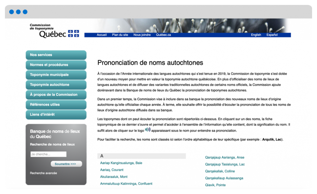 Cette ressource mise en ligne par la commission de toponymie du Québec en collaboration avec l’institut culturel Avataq contient les noms et prononciations de 125 lieux au Nunavik.