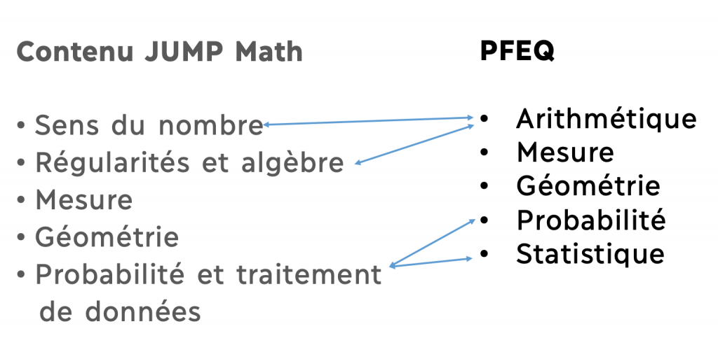 Le contenu en mathématique de l’arithmétique est abordé dans les unités JUMP Math sur le sens des nombres, les régulations et l’algèbre. Le contenu en mathématique sur les statistiques et la probabilité est abordé dans les unités JUMP Math sur les probabilités et le traitement des données.